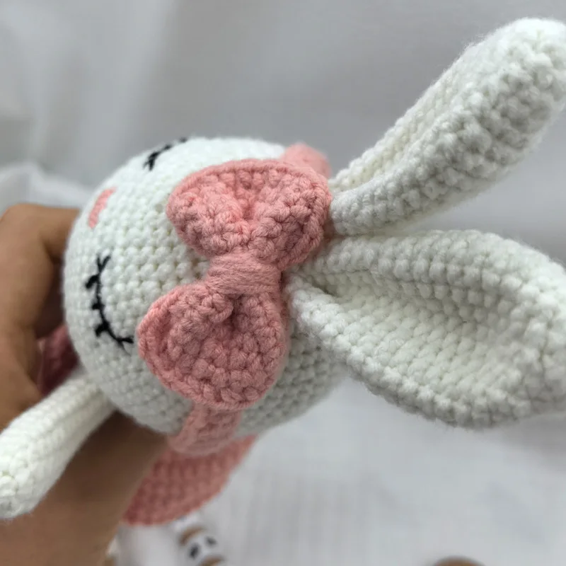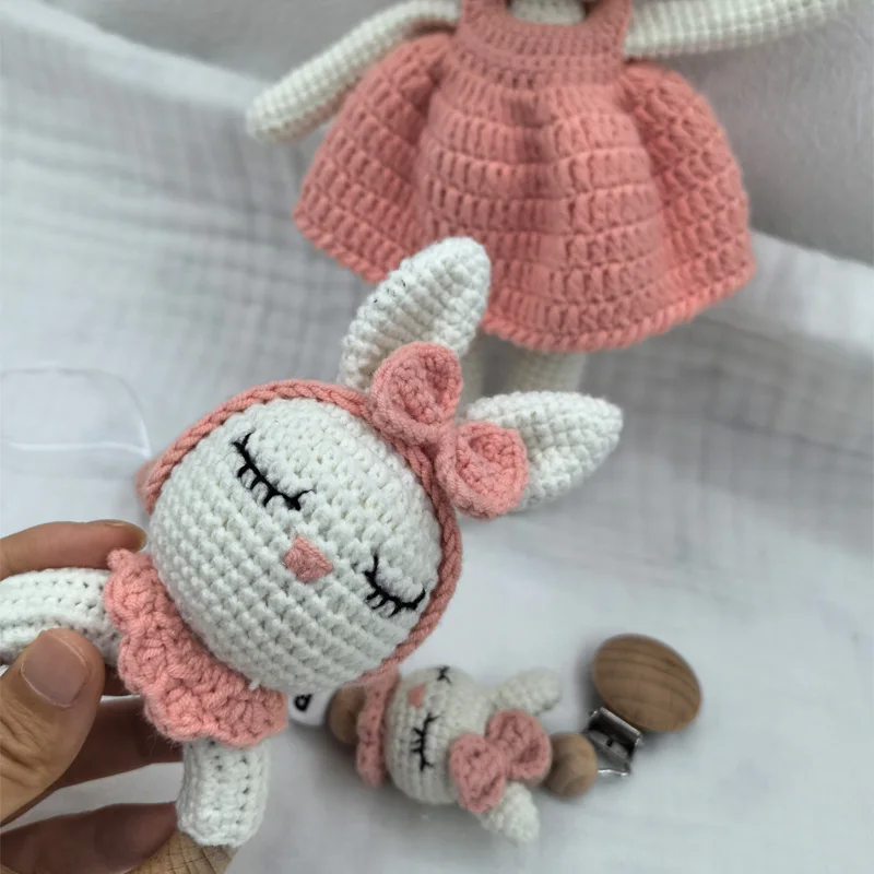 Soft Cuddles Meet Soothing Chews Our Crochet Bunny Teether Toy is the perfect blend of comfort and care. Handcrafted with baby-safe yarn and a smooth wooden teether, this adorable pink bunny offers gentle snuggles and teething relief in one sweet package. Thoughtfully designed for tiny hands, it’s a must-have for growing little bunnies!